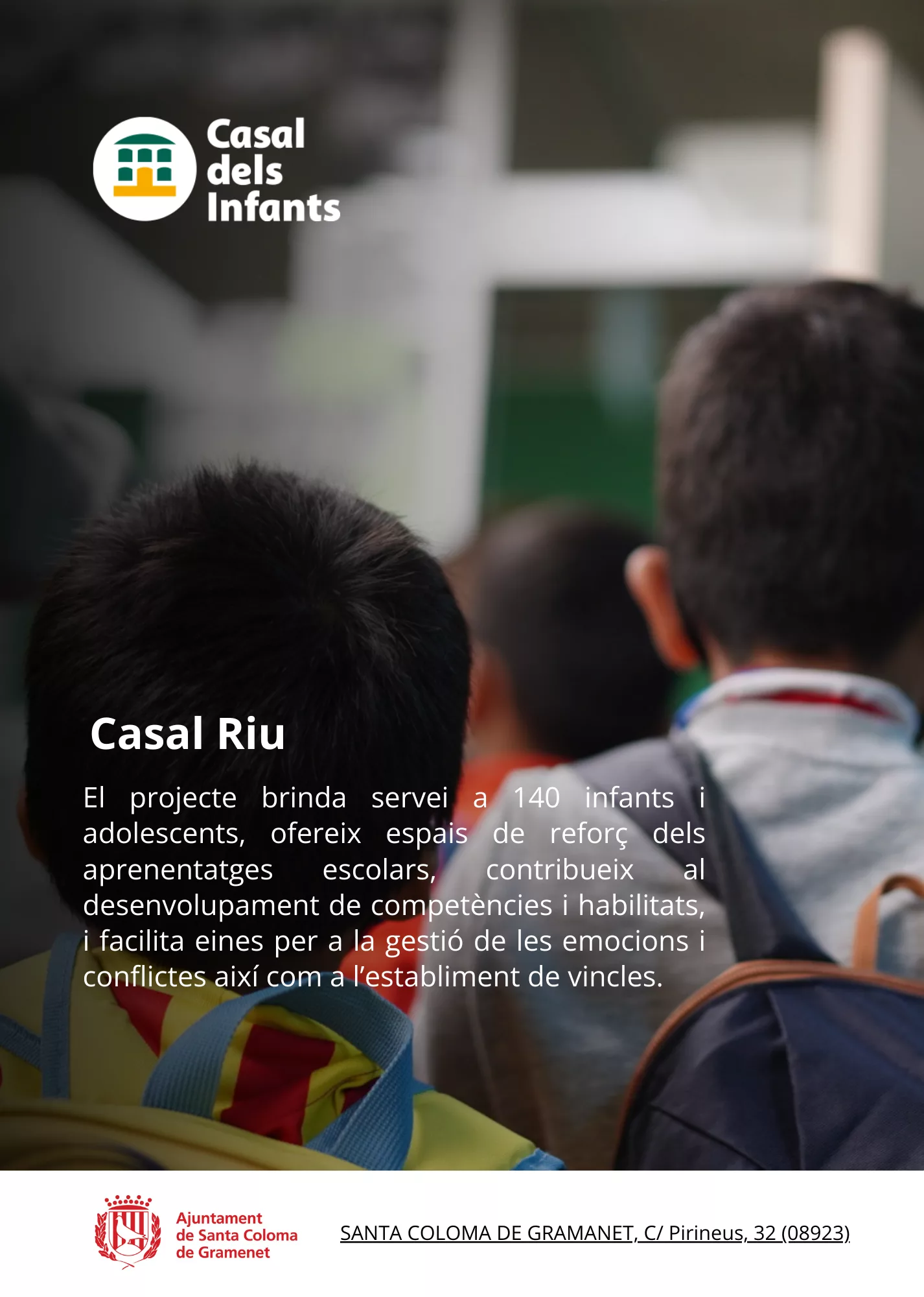 El ‘Casal Riu’ té com a finalitat assegurar la continuïtat del servei d’intervenció socioeducativa amb els infants i joves que eren atesos per l’anomenada Fundació Privada Germina, que va anunciar el tancament de les tres seus de Santa Coloma de Gramenet i Badalona aquest estiu.