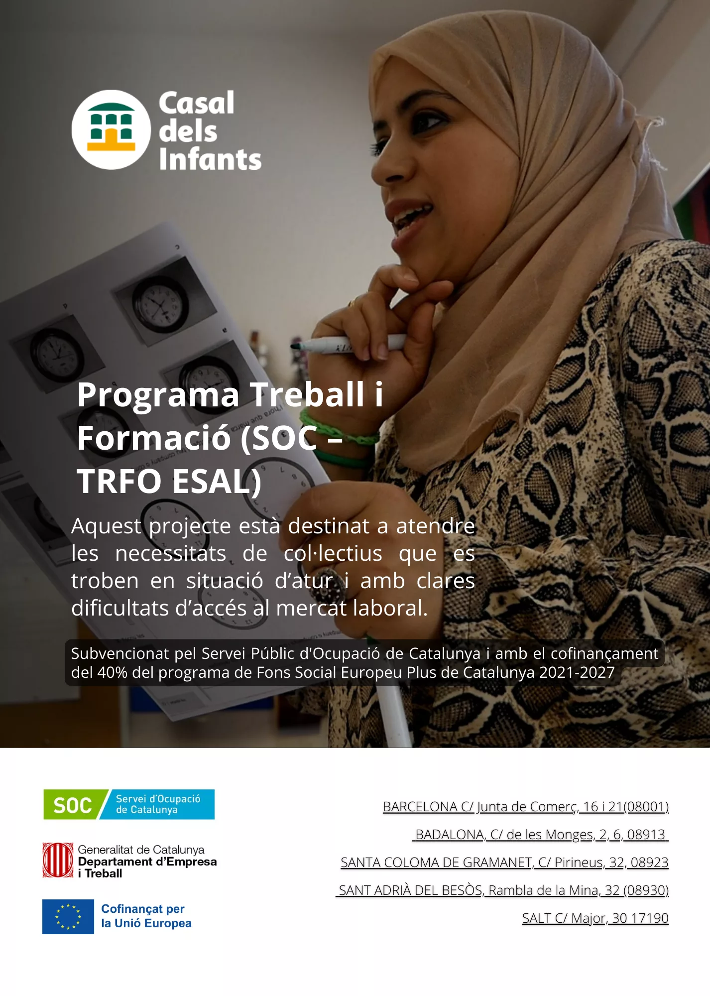 Al Casal dels Infants desenvolupem, en el marc de la convocatòria per a l’any 2024 en relació amb les actuacions del Programa Treball i Formació per a la participació de les entitats sense ànim de lucre (SOC – TRFO ESAL), el projecte ‘Programa Treball i Formació (SOC – TRFO ESAL)’.