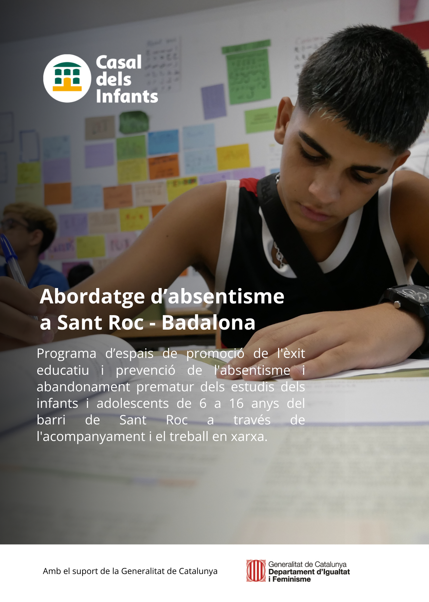 Al Casal dels Infants desenvolupem, en el marc de la convocatòria de 2023-2024, el projecte ‘Abordatge d’absentisme a Sant Roc – Badalona’, que té per objectius prevenir situacions d’absentisme i desvinculació del sistema educatiu d’infants i adolescents del barri de Sant Roc, i detectar i reconduir les situacions regulars d’absentisme escolar i abandonament escolar prematur dels infants i adolescents de les diferents escoles del barri.