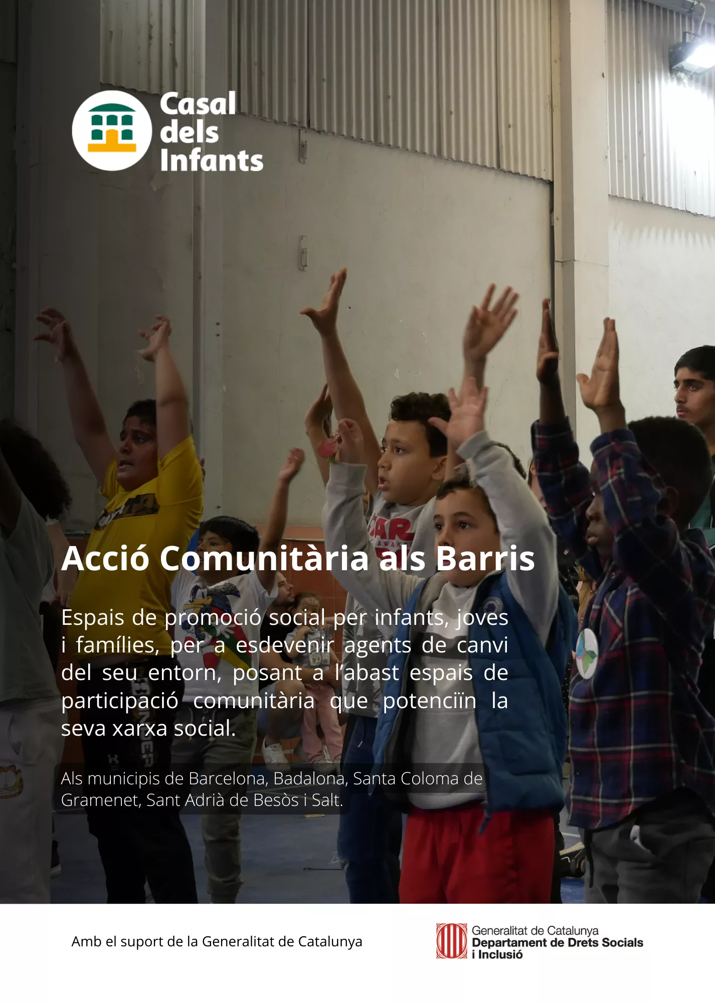 Al Casal dels Infants desenvolupem, dins la convocatòria Subvencions a entitats de l’àmbit de polítiques socials del Departament de Drets Socials i Inclusió per als exercicis 2025 i 2026 del Departament de Drets Socials i Inclusió, el projecte Acció Comunitària als Barris, que té per objectiu desenvolupar en les persones participants les competències i habilitats personals necessàries per a la participació a la comunitat, promoure la xarxa social de les persones i la seva participació activa en la comunitat, i donar suport a les entitats i xarxes veïnals del territori en les accions i processos comunitaris que sorgeixin al territori.