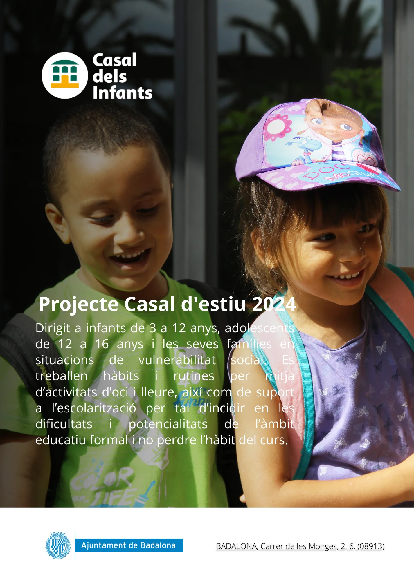 El projecte està dirigit a infants de 3 a 12 anys, adolescents de 12 a 16 anys i les seves famílies en situacions de vulnerabilitat social. Es treballen hàbits i rutines per mitjà d’activitats d’oci i lleure, així com de suport a l’escolarització per tal d’incidir en les dificultats i potencialitats de l’àmbit educatiu formal i no perdre l’hàbit del curs. També es realitzen activitats per al desenvolupament de les diferents habilitats socials i relacionals, a través d’activitats engrescadores que fomenten la creativitat i l’autonomia dels infants. Alhora, es realitzen colònies, les quals permeten l’apropament dels infants a un entorn natural que possibilita el treball de rutines, hàbits i habilitats de tipus personal i relacional per mitjà de la convivència en grup.