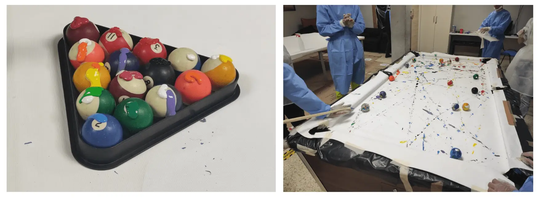 Boles amb pintura i nois i noies jugan al billar amb pintura.