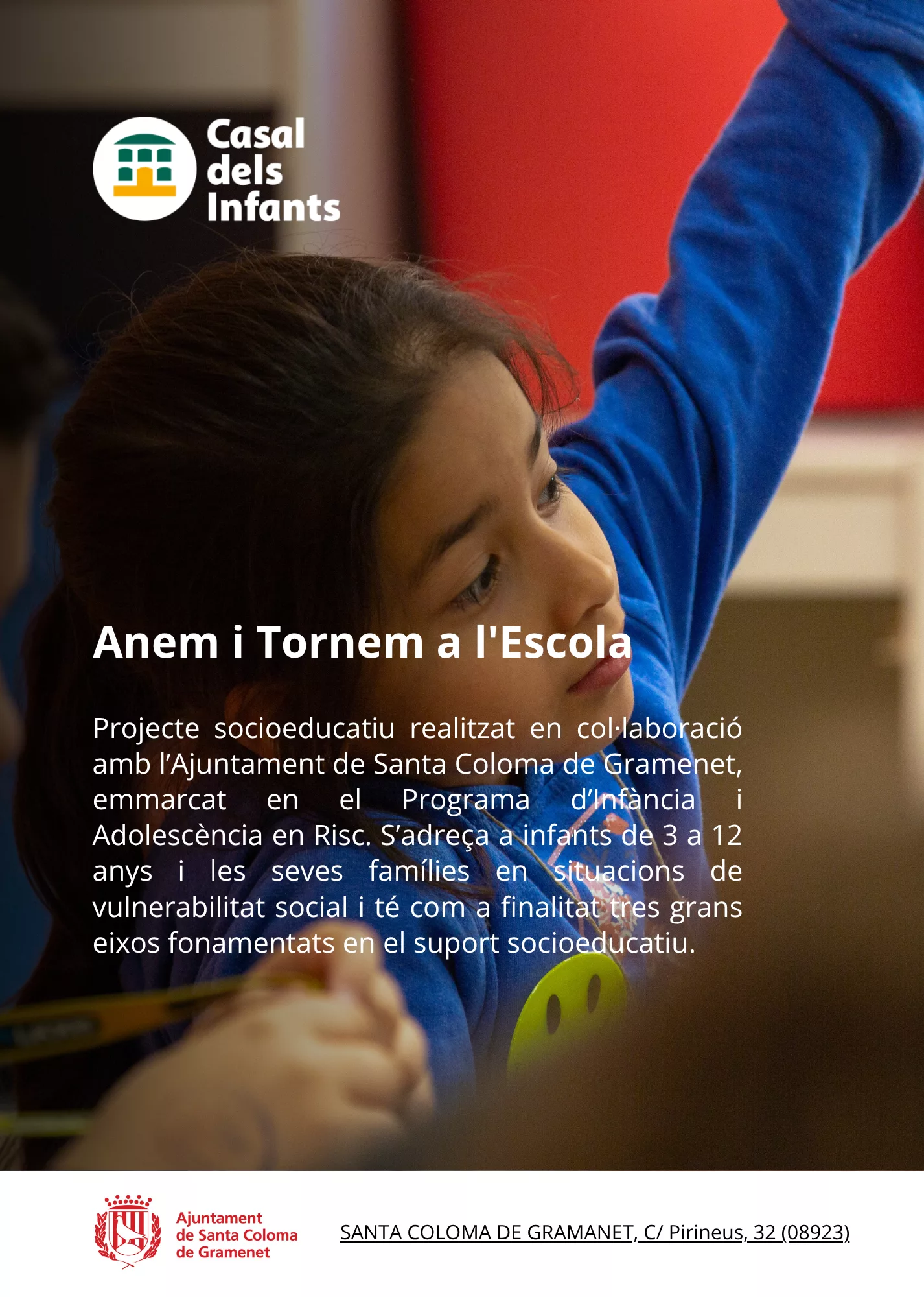 Al Casal dels Infants desenvolupem, dins del Conveni de Col·laboració entre l’Ajuntament de Santa Coloma de Gramenet i el Casal dels Infants, el projecte ‘Anem i Tornem a l’Escola’, que té per objectiu prevenir i intervenir en les situacions de risc social dels infants de 3 a 12 anys i les seves famílies oferint una atenció socioeducativa integral i intensiva.