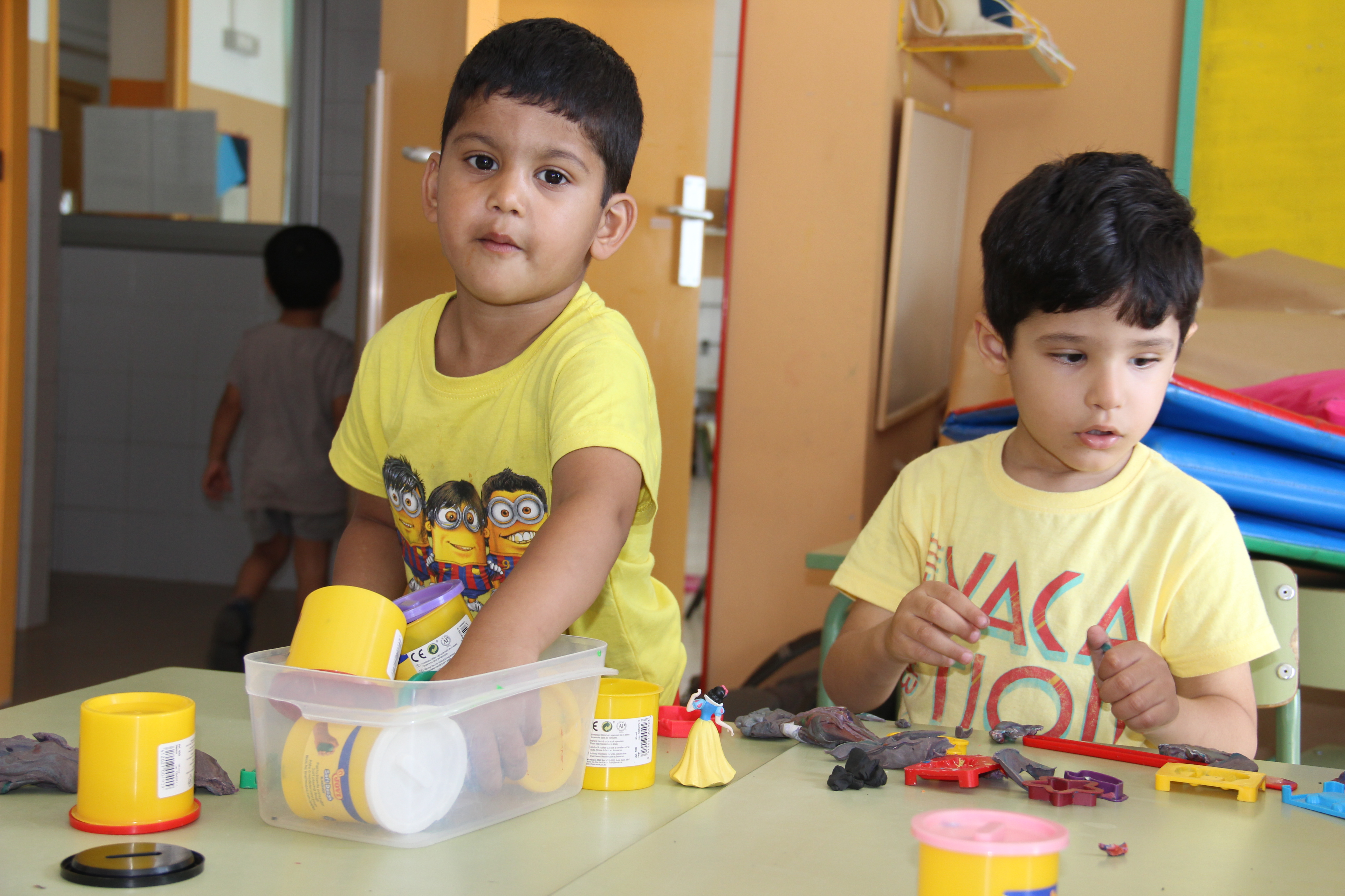 Mentre la seva mare parlava, a l’altra aula l’Omar feia una bola amb plastilina grisa i l’aixafava dins un motlle perquè en sortís un lleó. L’Abdur Rahman es concentrava en una figura més aviat abstracta, el Gurman s’ajudava amb un ganivet de plàstic i l’Aryan preferia fer volar un helicòpter de joguina. La Judit, ben atenta a que tots compartissin els estris i juguessin sense conflicte, un valor important per a la socialització.