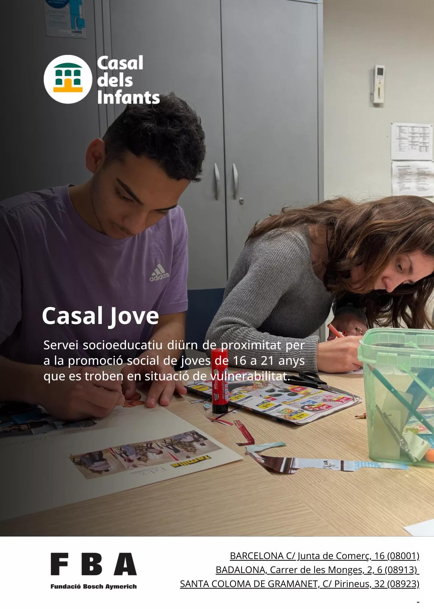 El Casal Jove és un servei socioeducatiu diürn de proximitat per a la promoció social de joves de 16 a 21 anys que es troben en situació de vulnerabilitat.