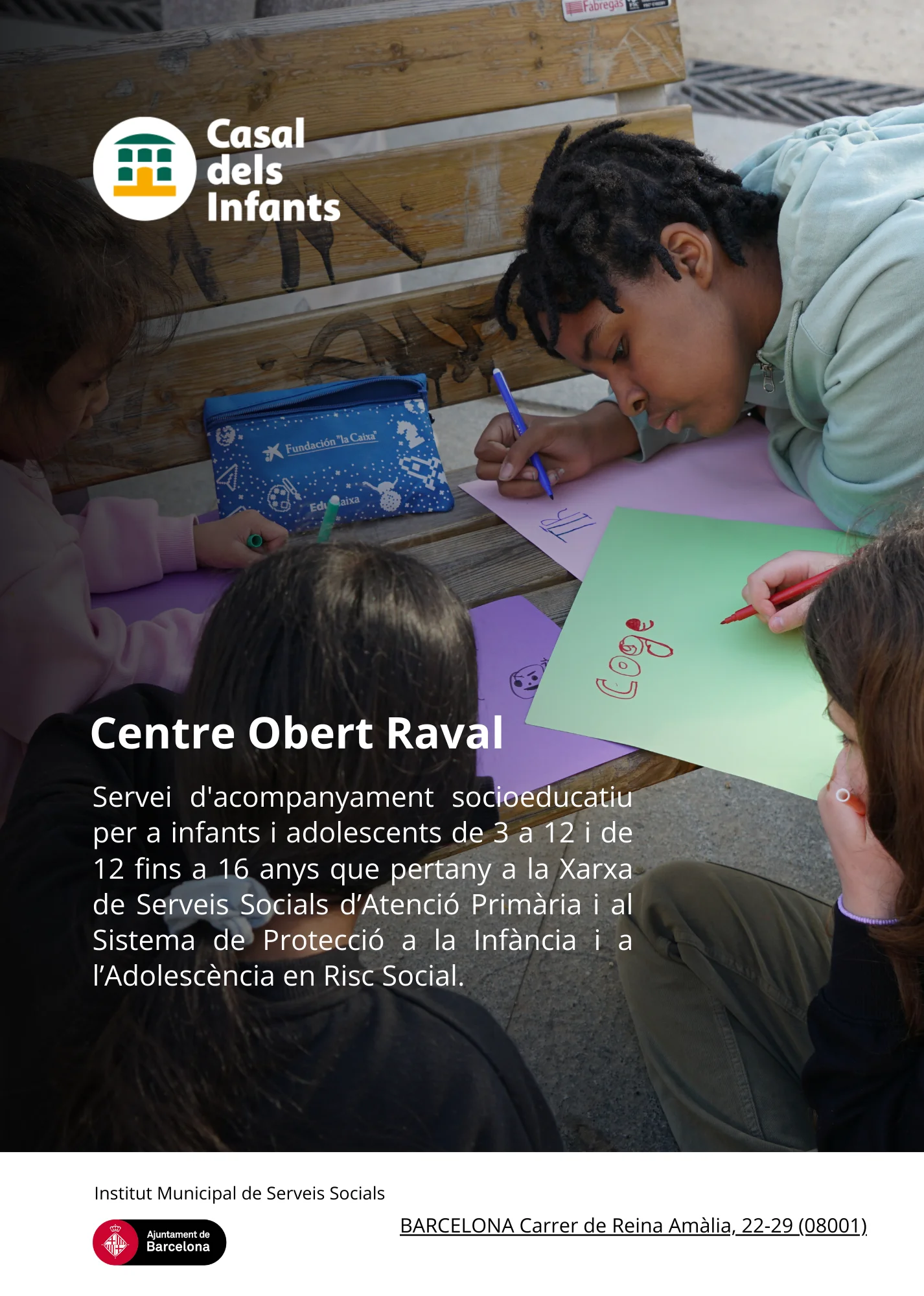 Al Casal dels Infants desenvolupem, dins del marc del concert social de places per a la prestació del servei municipal d’intervenció socioeducativa – centres oberts a la ciutat de Barcelona, el projecte ‘Centre Obert Raval’, que té per objectiu prevenir i intervenir en les situacions de risc social d’infants de 3 a 12 i adolescents de 12 a 16 anys oferint una atenció socioeducativa integral i intensiva.