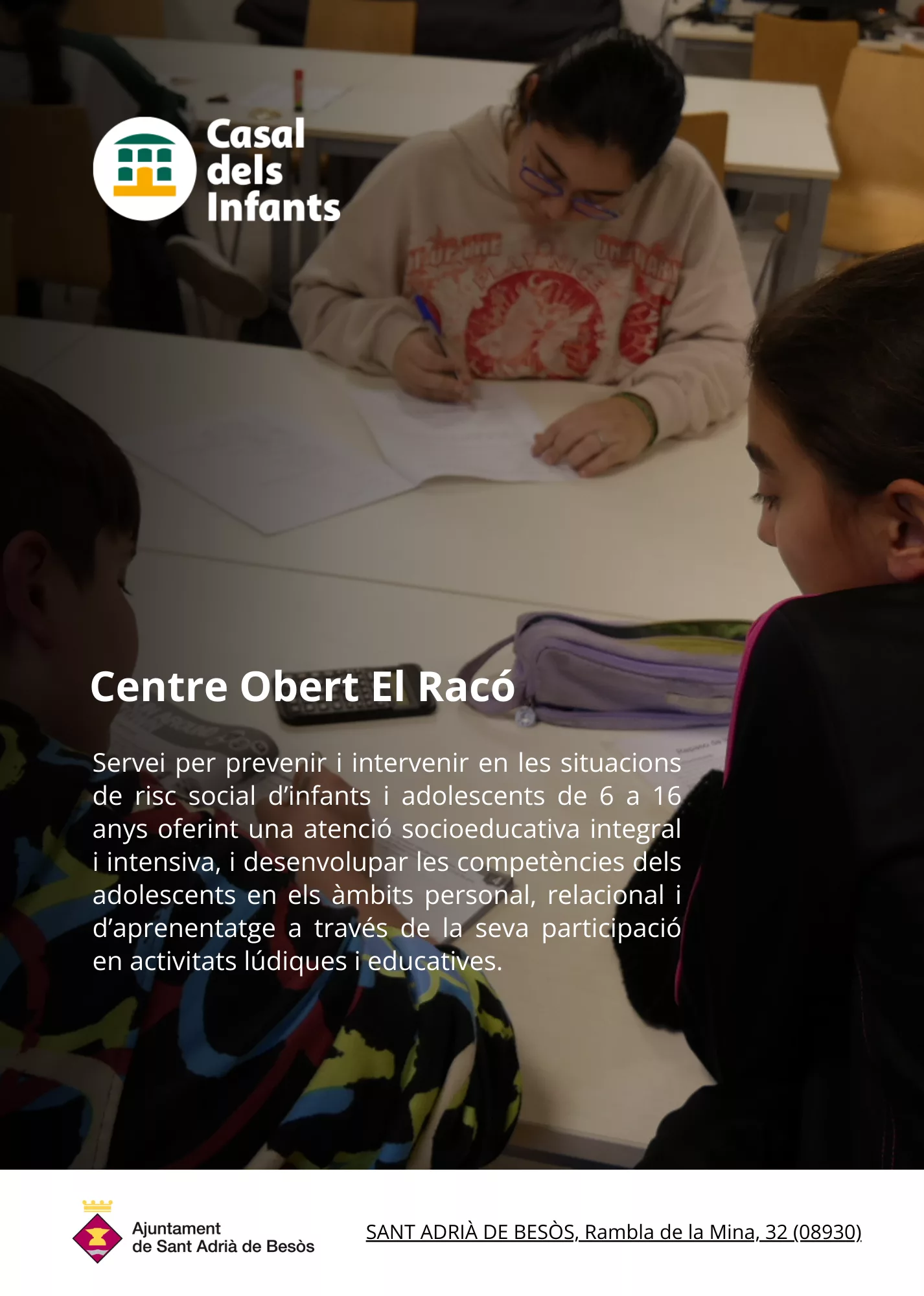Al Casal dels Infants desenvolupem, dins la concertació de places per a la prestació del Servei de Centres Oberts de la ciutat de Sant Adrià de Besòs període 2024-2028, el projecte ‘Centre Obert El Racó’.