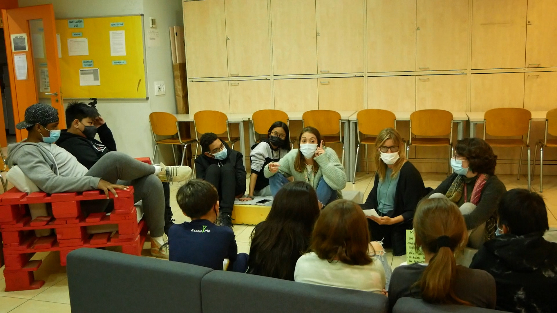 En cinc minuts de reunió, ja s’ha fet una proposta, s’ha deliberat entre tots i totes què preferien i s’ha pres una decisió: el Consell es trasllada de les cadires en rotllana a una circumferència irregular de sofàs i matalassos a terra. Així estan més còmodes. Els nois i noies, que són els delegats i delegades representants del seu grup, tenen ganes de dir la seva i compartir els dubtes, les propostes i les iniciatives que han recollit. El Consell està compost per dos delegats i delegades de cada grup d’edat, dels 6 als 21 anys, que són escollits de manera assembleària pels seus companys i companyes. Per torns, els delegats enumeren les propostes de millora dels seus grups i es comenta la viabilitat d’aquestes peticions, mentre que la Laia Ribas apunta en una cartolina gran aquelles que estan dirigides al barri.
