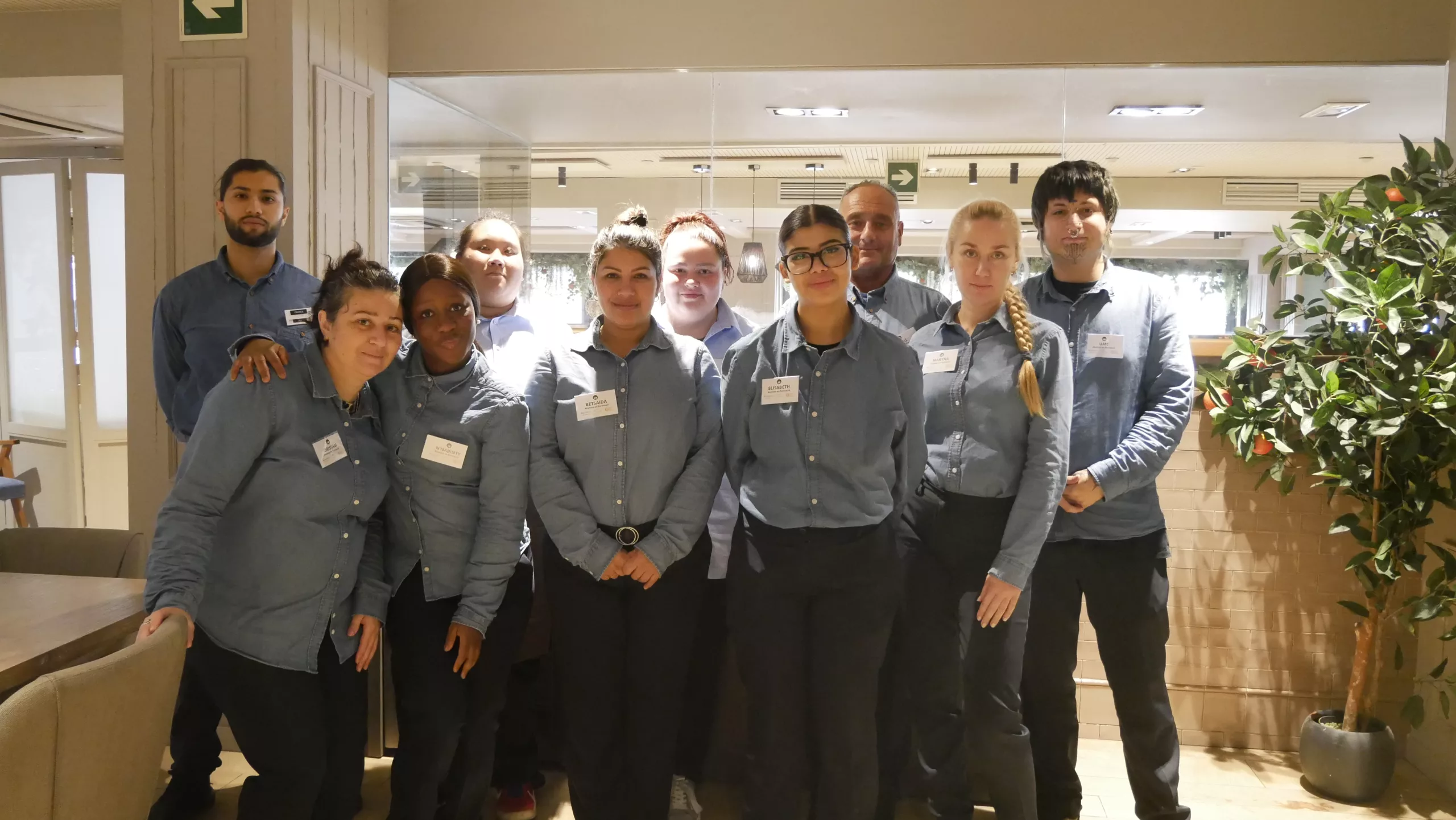 És l’hora de l’esmorzar, i dos d’aquests participants recullen i preparen les taules per tornar a ser utilitzades al bufet de l’hotel adjunt al restaurant, l’hotel Royal Ramblas, tasca que els i les alumnes es van rotant durant la setmana. Mentrestant, l’educador referent del PFI del Casal dels Infants, el Juan Carlos Blanco, dona la benvinguda a la resta i es preparen per començar la jornada.