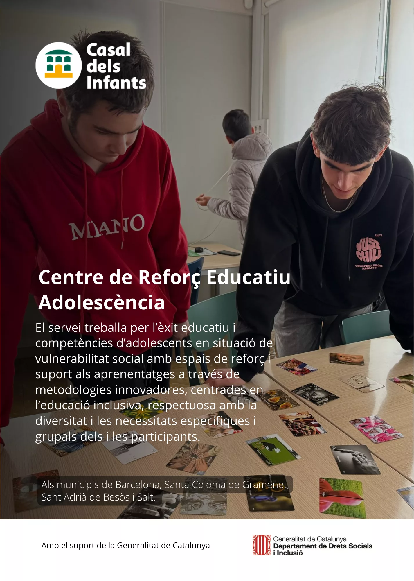 El ‘Centre de Reforç Educatiu Adolescència’ dóna resposta a les necessitats acadèmiques i de treball competencial d’adolescents vinculats als centres educatius de secundària dels barris on és present el Casal dels Infants. El servei treballa per l’èxit educatiu i competències d’adolescents en situació de vulnerabilitat social amb espais de reforç i suport als aprenentatges a través de metodologies innovadores, centrades en l’educació inclusiva, respectuosa amb la diversitat i les necessitats específiques i grupals dels i les participants.