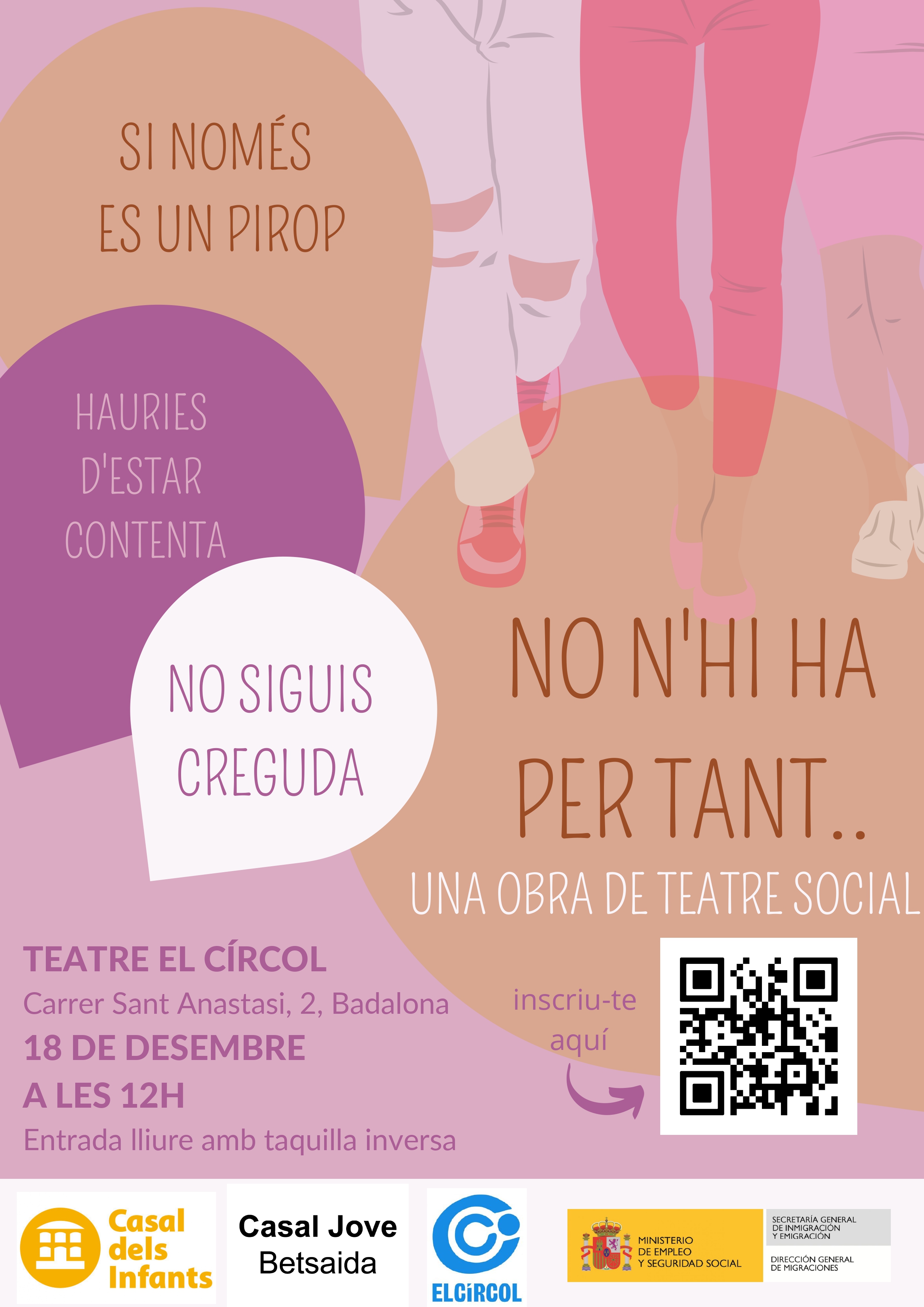 Tampoco es para tanto és una obra de teatre fòrum creada i representada per participants del Casal Jove la Betsaida del Casal dels Infants de Badalona. El guió el van treballar les noies del grup de teatre, a partir de situacions de violències masclistes que havien viscut en el seu dia a dia. Com tota obra de teatre fòrum, el públic té l’oportunitat d’intervenir, refer escenes i canviar el final de l’obra, que ja es va representar l’any passat en la programació de l’últim 8 de març del barri de Llefià, a la Parròquia de Sant Antoni de Pàdua. Enguany es representarà al teatre El Círcol el dissabte 18 de desembre a les 12 h. L’entrada és lliure amb inscripció prèvia (feu-la aquí) i amb taquilla inversa (l’espectador farà el donatiu que cregui adequat quan acabi la funció).