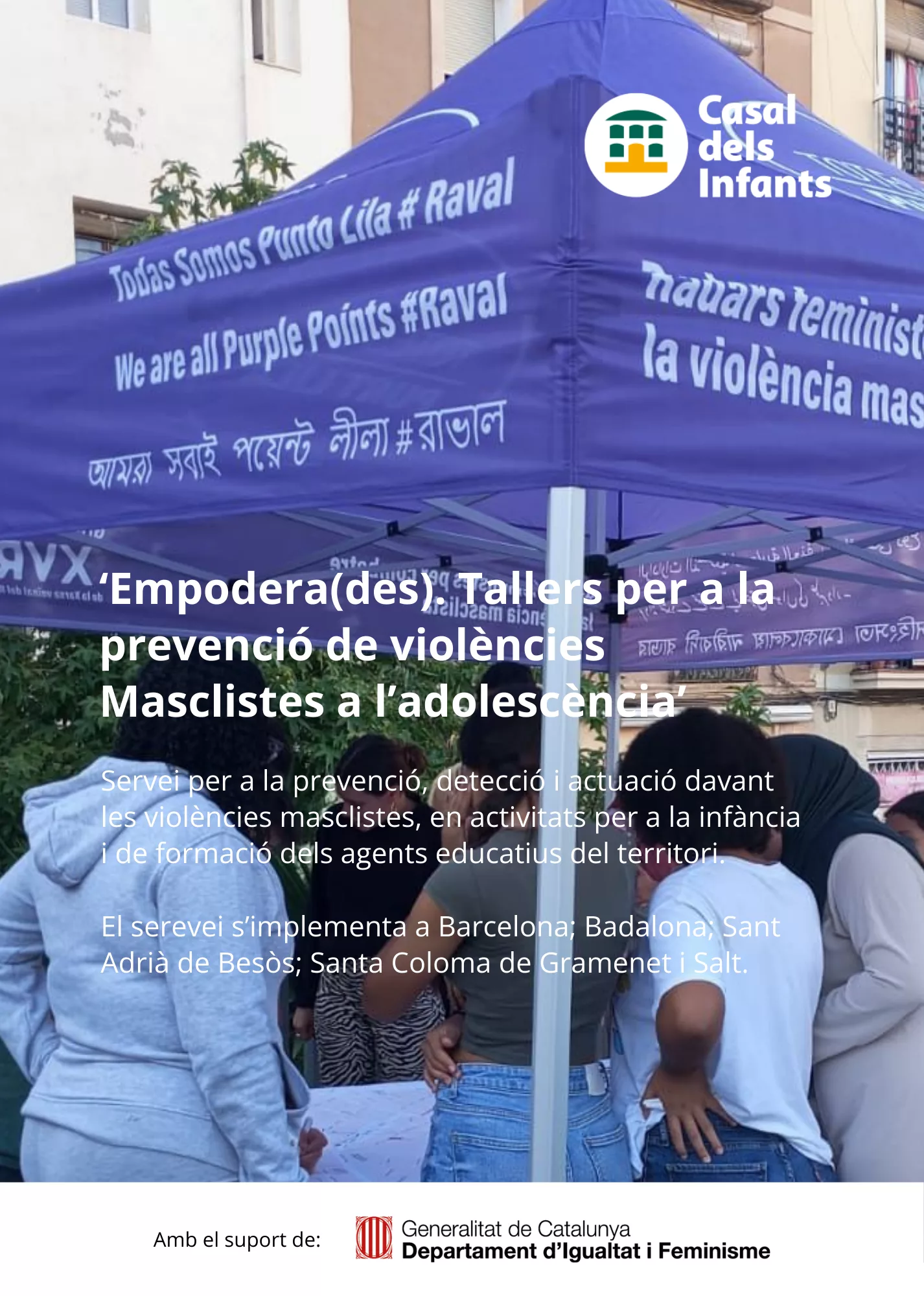Al Casal dels Infants implementem el projecte ‘Empodera’t. Tallers per a la prevenció de violències Masclistes a l’adolescència’, en la seva convocatòria 2023-2024, amb el suport del Departament d’Igualtat i Feminisme de la Generalitat de Catalunya. El projecte consisteix en activitats orientades específicament a l’adolescència i a la formació de tots els agents educatius (equips educatius de l’entitat, família i territori), amb l’objectiu de prevenir, detectar i fer front a les violències masclistes.