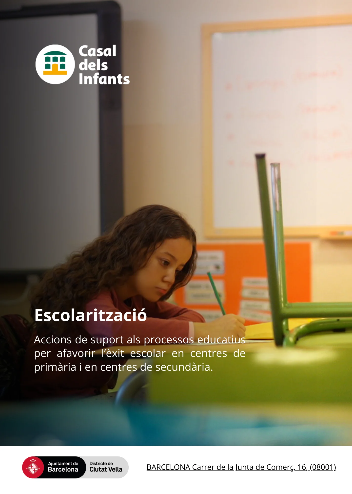 Al Casal dels Infants desenvolupem, dins del conveni entre l’Ajuntament de Barcelona i el Casal dels Infants per al desenvolupament del Programa Accions de suport a la població en risc d’exclusió social a Barcelona 2024, el projecte ‘Escolarització’, que té per objectiu d’afavorir l’èxit educatiu dels infants i dels adolescents mitjançant espais de suport a l’aprenentatge fora de l’horari lectiu i fomentant la participació de les famílies i d’altres agents educatius de l’entorn.