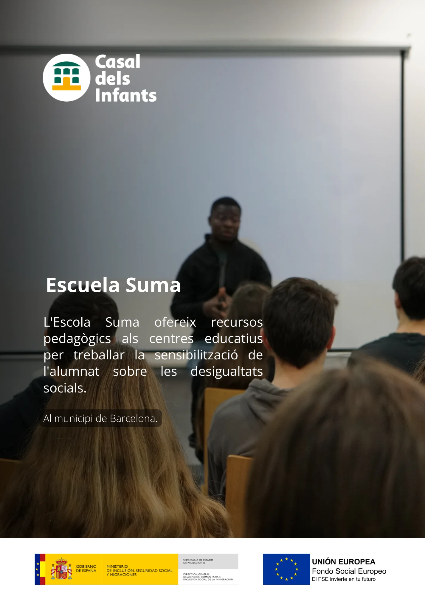 Al Casal dels Infants desenvolupem el projecte ‘Escuela Suma’, que té per objectiu sensibilitzar i activar socialment l’alumnat de les escoles i la comunitat educativa, i els treballadors i treballadores de les empreses que col·laboren amb el Casal, en relació amb la discriminació i racisme que pateixen moltes persones d’origen estranger als seus propis municipis, a través de diferents eixos.