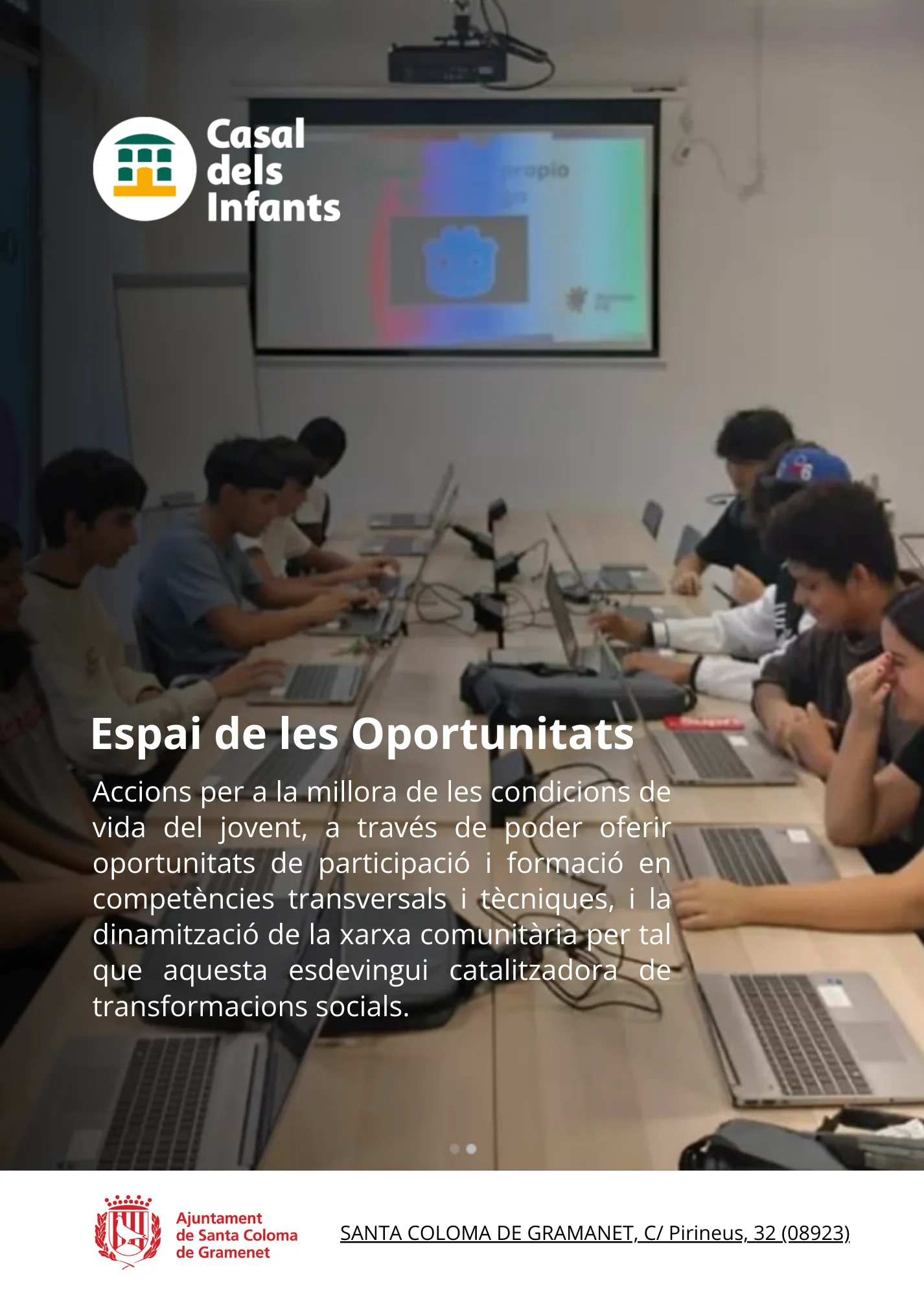 Al Casal dels Infants formem part, dins del conveni de Col·laboració entre l’Ajuntament de Santa Coloma de Gramenet i el Casal dels Infants per al projecte Espai de les Oportunitats per a l’any 2024, del projecte ‘Espai de les Oportunitats’, que té per objectiu la millora de les condicions de vida del jovent, a través de poder oferir oportunitats de participació i formació en competències transversals i tècniques, com a elements d’emancipació i d’autonomia personal, i la dinamització de la xarxa comunitària per tal que aquesta esdevingui catalitzadora de transformacions socials.