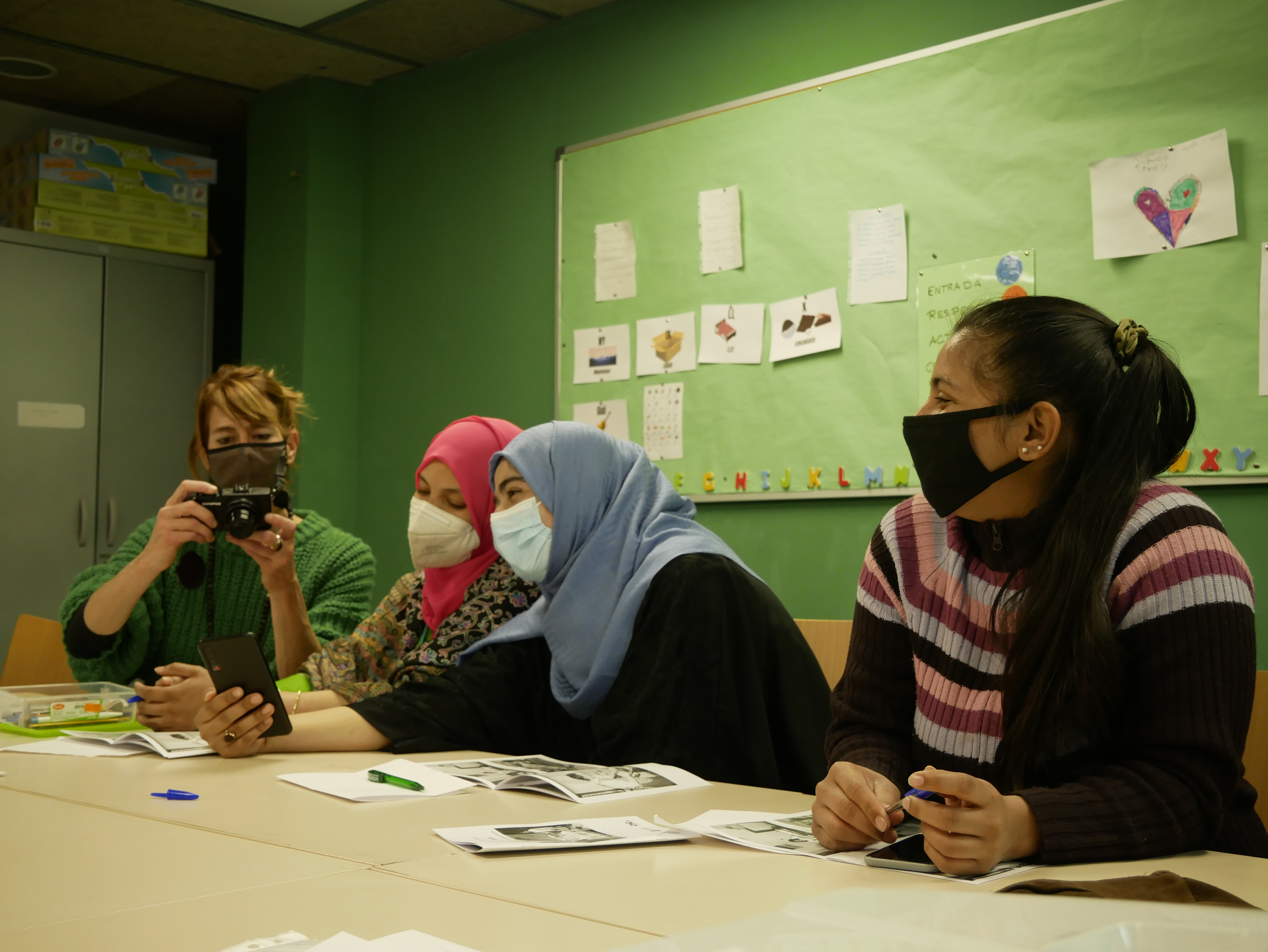 En la sessió de la dona i el treball, del 3 de març, van repassar i comentar fotografies de dones treballant en diferents oficis: artista, fotògrafa, carnissera, administrativa, cuinera, perruquera. A mesura que anava avançant la sessió, les participants apuntaven totes aquelles paraules que els eren noves, ja que l’activitat fomenta també l’aprenentatge i l’ús de la llengua per donar suport en la integració social d’aquestes dones. “Cada dia aprenem una paraula nova. Aprenem escoltant i escrivint”, explica l’Eila Rahman, participant del Casal Familiar.