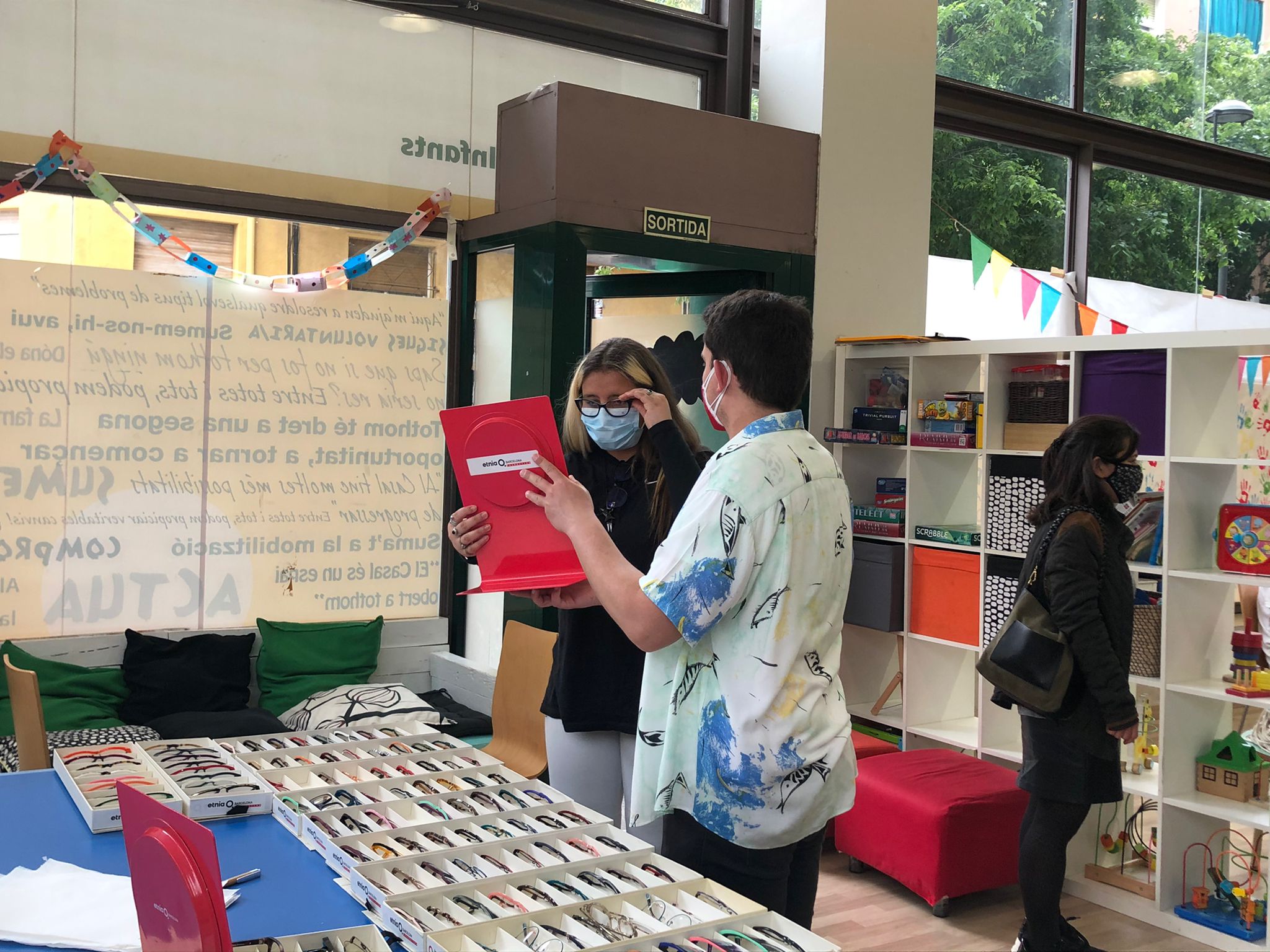 Una adolescent del Casal dels Infants de Santa Coloma s’emprova unes ulleres al costat d’un voluntari de la fundació Etnia Barcelona