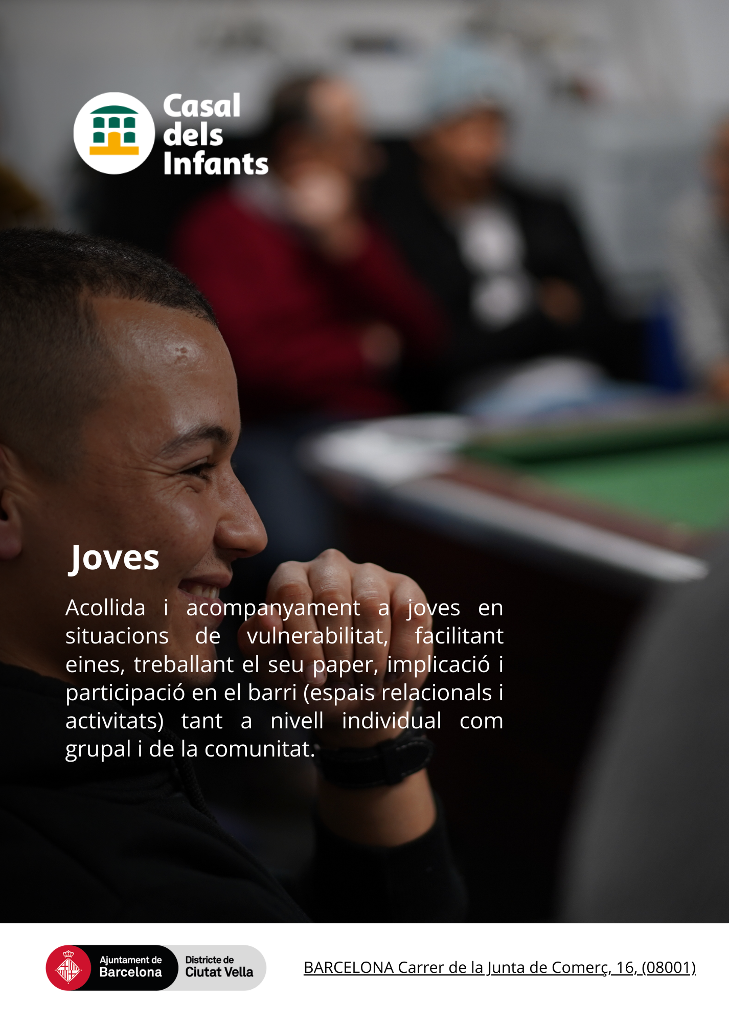 Al Casal dels Infants desenvolupem, dins del conveni entre l’Ajuntament de Barcelona i el Casal dels Infants per al desenvolupament del Programa Accions de suport a la població en risc d’exclusió social a Barcelona 2024, el projecte ‘Joves’.