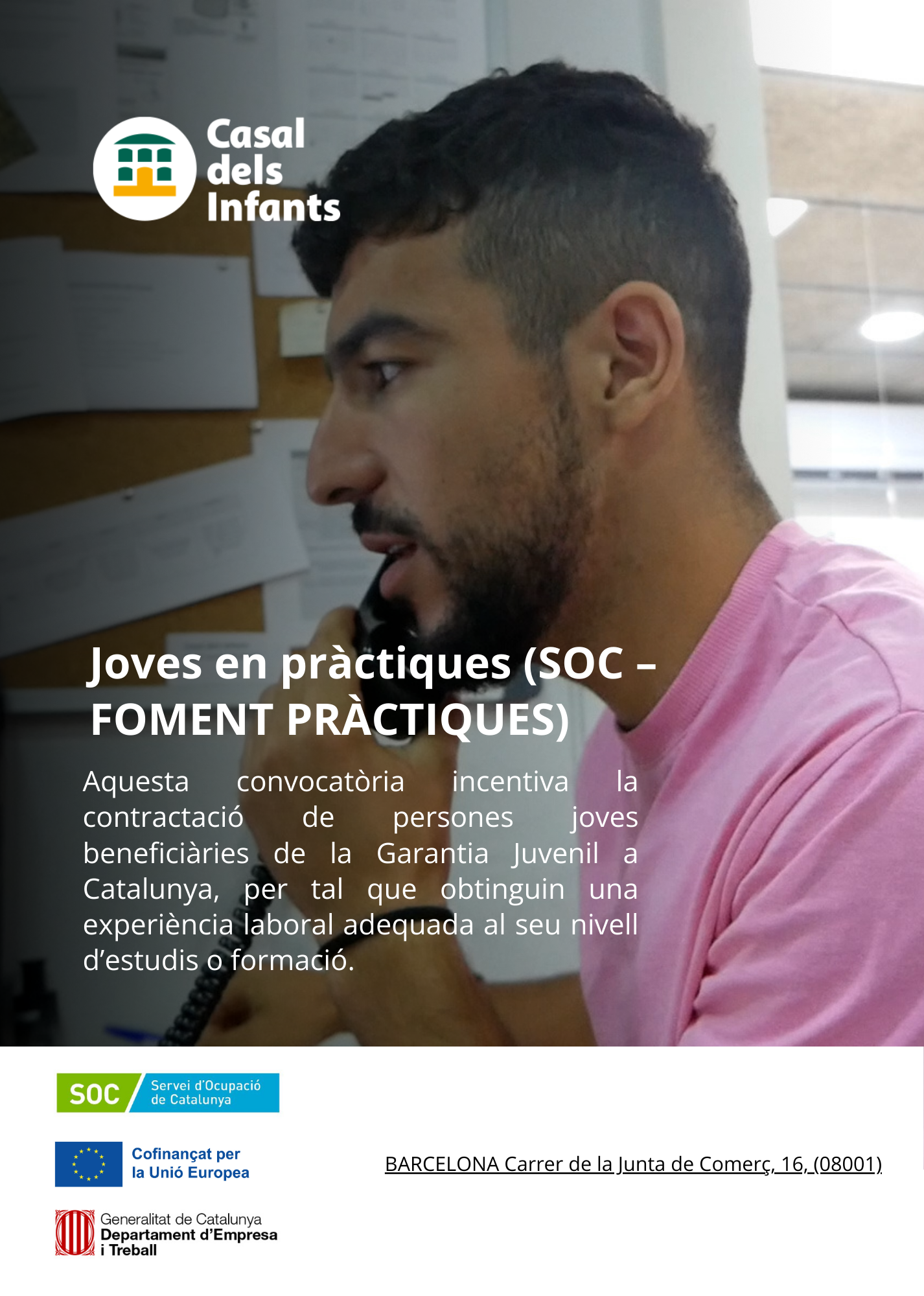 Al Casal dels Infants participem, dins la convocatòria per a l’any 2023 per a la concessió de subvencions destinades a la realització de contractes formatius per a l’obtenció de pràctica professional, en el projecte ‘Joves en pràctiques (SOC – FOMENT PRÀCTIQUES)’, que té per objectiu incentivar la contractació de persones joves beneficiàries de la Garantia Juvenil a Catalunya, per tal que obtinguin una experiència laboral adequada al seu nivell d’estudis o formació.