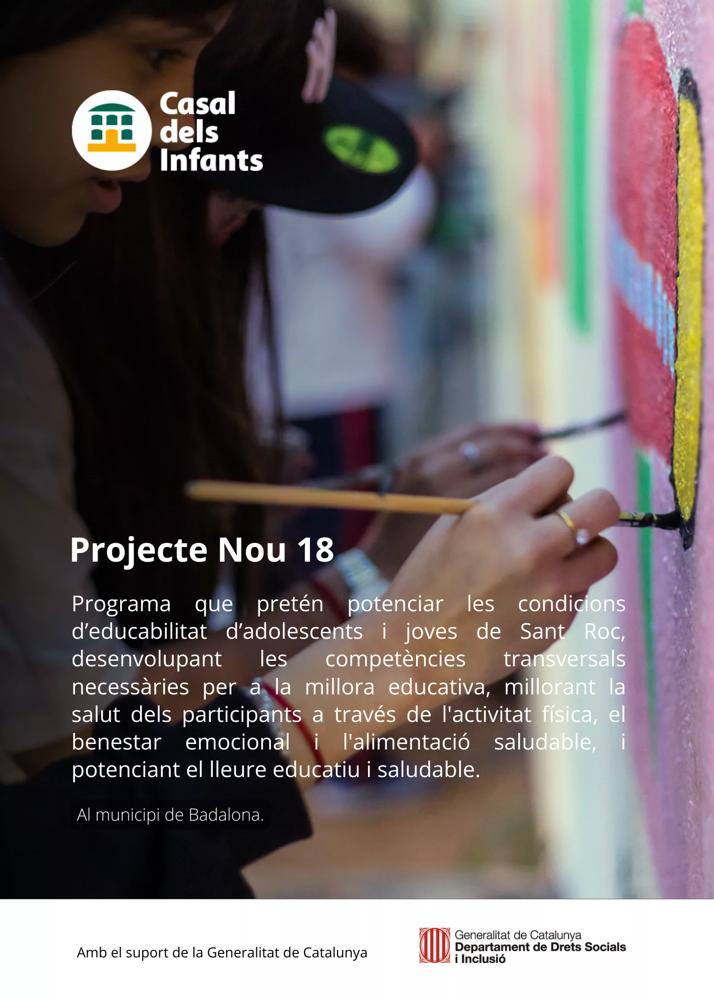 Al Casal dels Infants desenvolupem, dins la convocatòria de projectes experimentals per a l’abordatge integral de la pobresa infantil des dels barris (Pla pilot derivat de l’Estratègia de Lluita contra la pobresa infantil a Catalunya) del Departament de Drets Socials i Inclusió, el projecte ‘Projecte Nou 18’, que té per objectiu garantir la igualtat d’oportunitats i equitat educativa dels i de les adolescents de Sant Roc millorant les condicions d’educabilitat.