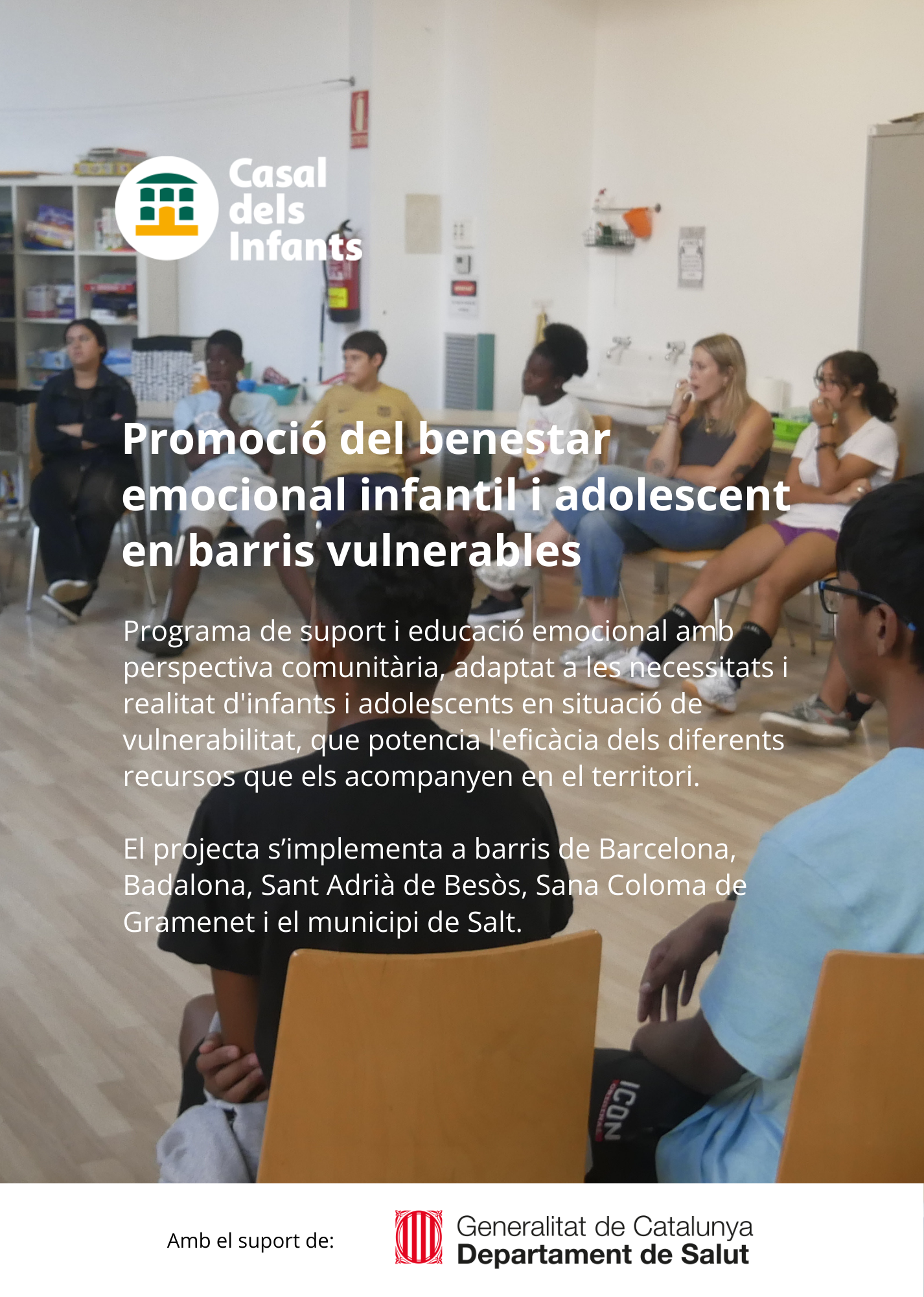 Al Casal dels Infants desenvolupem el projecte “Promoció del benestar emocional infantil i adolescent en barris vulnerables”, en el marc de la convocatòria 2024 del de subvencions per a entitats sense afany de lucre que desenvolupin actuacions en l’àmbit de la salut per al foment de la salut, el suport als pacients i a les famílies, impulsada pel Departament de Salut de la Generalitat de Catalunya.