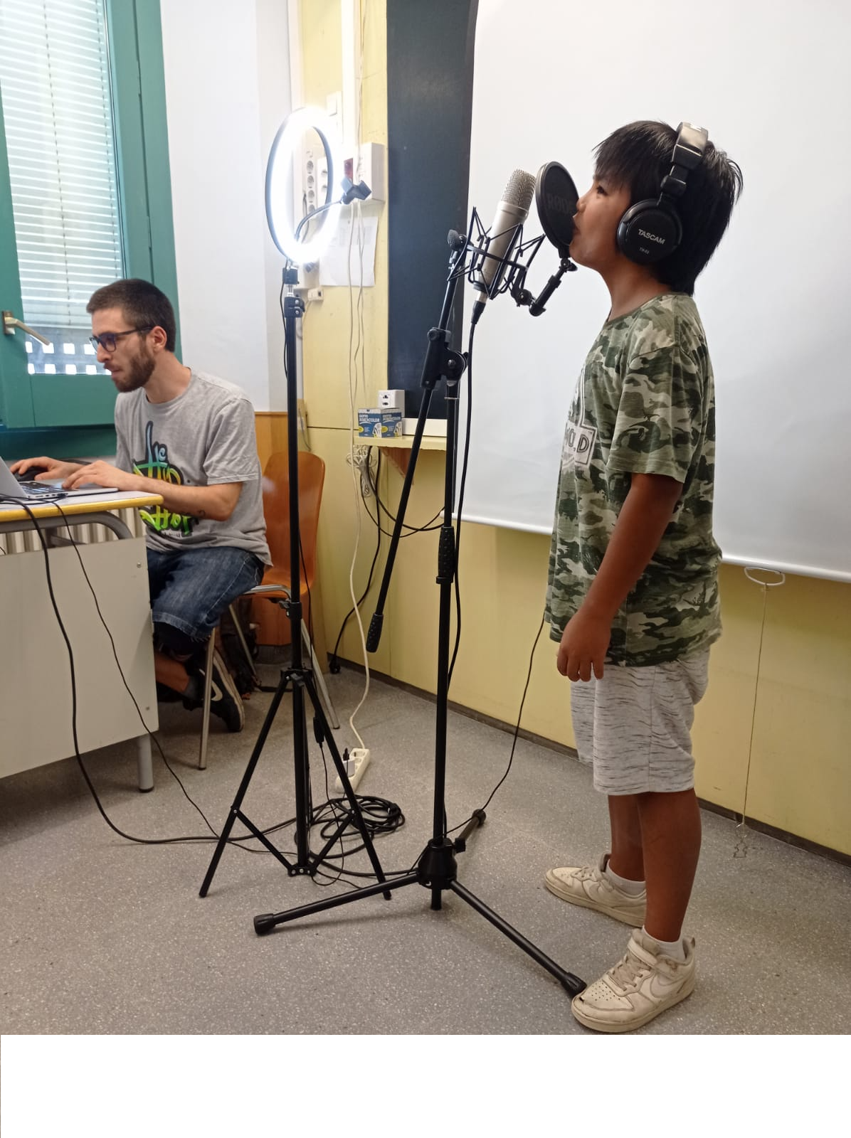 Nen de peu canta a un micro amb els auriculars posats, mentre un home amb un ordinador grava la veu.