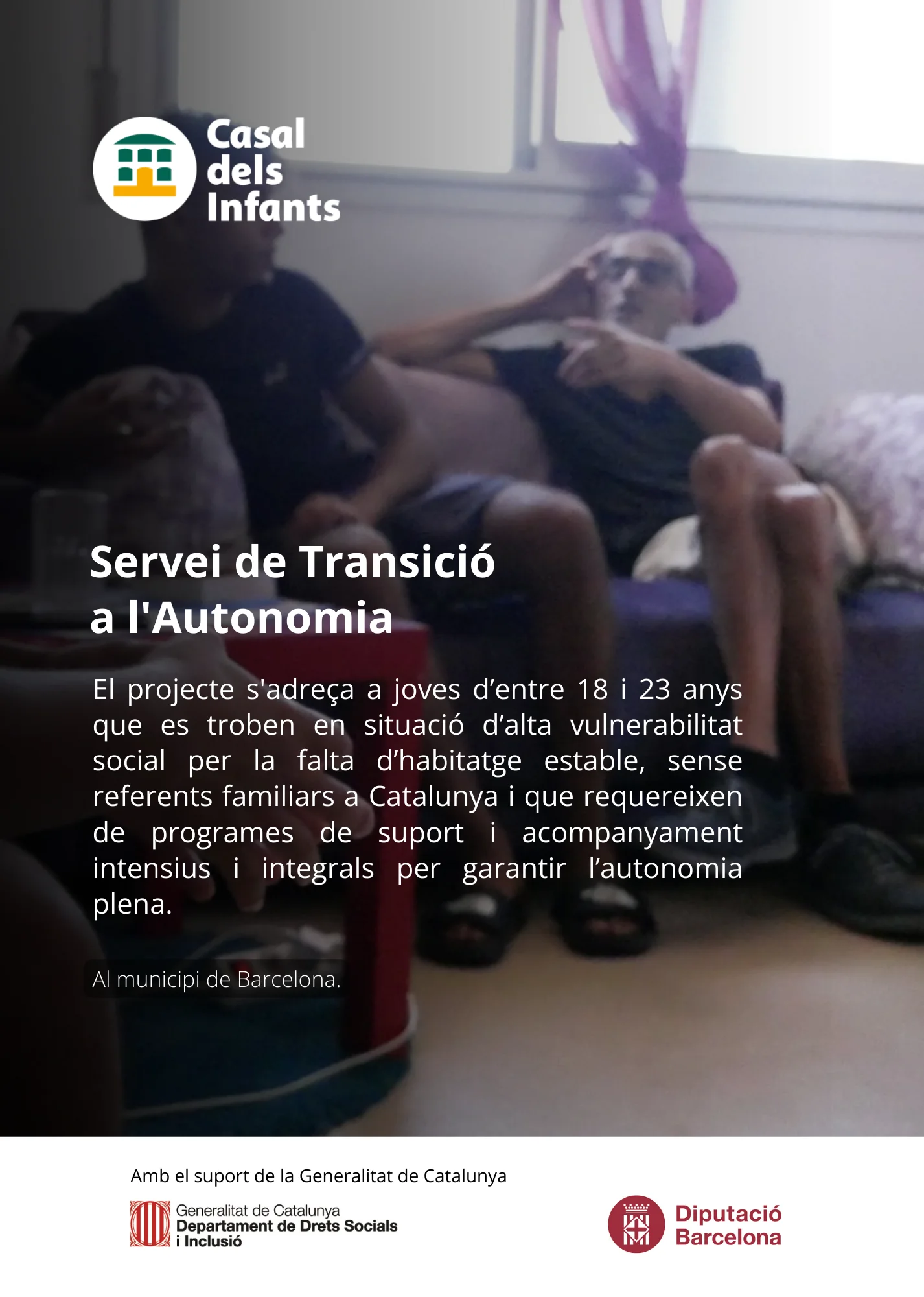 Al Casal dels Infants desenvolupem el projecte ‘Servei de Transició a l’Autonomia’, que té per objectiu fomentar l’autonomia personal de joves de 18 a 23 anys sense xarxa social de suport i en situació d’alta vulnerabilitat social derivada de la falta d’habitatge estable, mitjançant itineraris integrals i intensius que els permeti accedir a la xarxa d’habitatge i sostenir un itinerari posterior.