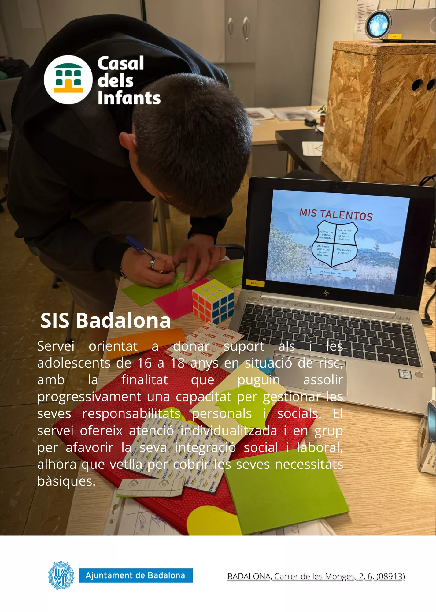 Al Casal dels Infants desenvolupem, dins del Programa d’Intervenció Socioeducativa de l’Ajuntament de Badalona, el projecte ‘SIS Badalona’, que té per objectius potenciar la promoció personal i social de les persones joves per a què esdevinguin agents de canvi de la seva realitat i la del seu entorn, desenvolupar en les persones joves les competències i habilitats personals necessàries per a la vida autònoma, potenciar la continuïtat formativa de les persones joves i promoure la xarxa social de les persones joves i la seva participació en la comunitat.