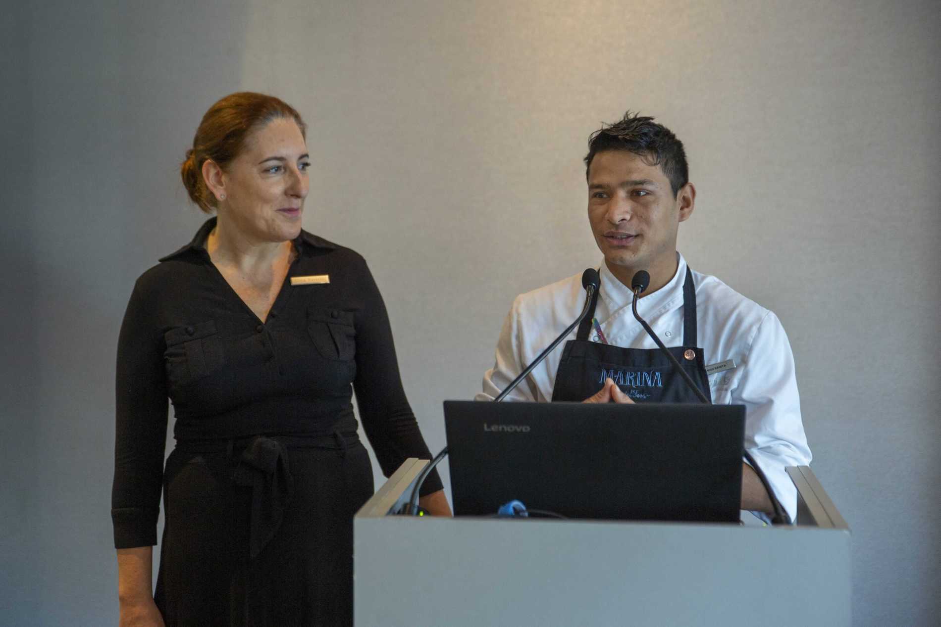 Manish Baniya, xef de l’hotel Arts, intervé acompanyat de Sílvia Raventós, coordinadora de Recursos Humans de l’empresa