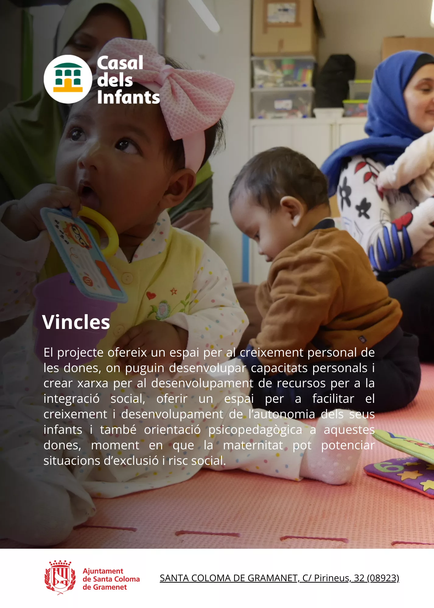 El projecte ofereix un espai per al creixement personal de les dones, on puguin desenvolupar capacitats personals i crear xarxa per al desenvolupament de recursos per a la integració social, oferir un espai per a facilitar el creixement i desenvolupament de l’autonomia dels seus infants i també orientació psicopedagògica a aquestes dones, moment en que la maternitat pot potenciar situacions d’exclusió i risc social. L’espai de treball grupal que ofereix Vincles facilita la creació d’una xarxa social per a l’intercanvi i el suport entre aquestes dones i infants, essent una de les finalitats claus del projecte.