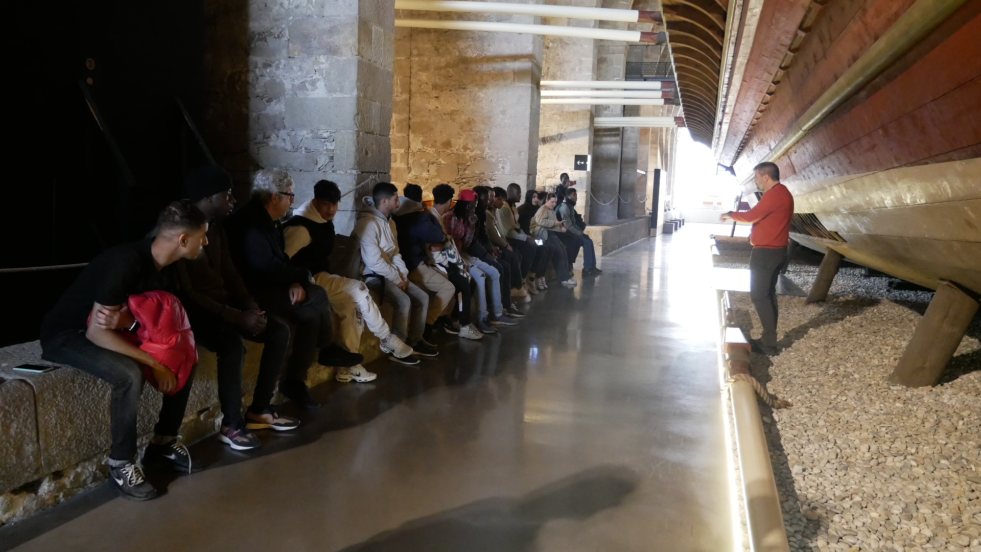 Durant la visita guiada amb l’Isma Garcia, cap de la Unitat de Programes Educatius del Museu, el record de casa i de llengua materna de la majoria dels joves està molt viu. “Allò és el Marroc!”, assenyala algú en la foscor de la sala mentre un vídeo reprodueix un mapa del Mediterrani i els països que l’envolten. Parlar d’història els porta a parlar de l’al-Àndalus, de l’Espanya musulmana i de la influència de l’àrab al castellà actual en paraules com “almacén” (magatzem), com el que es troben en la rèplica de la Galera Reial. Tot això, parant tants cops com calgui perquè els que dominen més el castellà agafin el rol d’intèrprets per traduir a l’àrab i al francès per als seus companys nouvinguts.